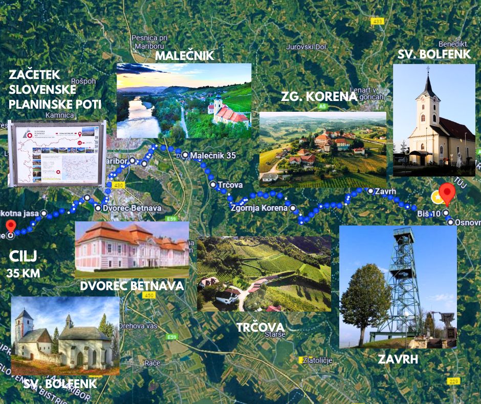 🔹 15:55 - 18:10 | Pričetek vzpona na Pohorje (začetek Slovenske planinske poti) s ciljem pri cerkvi Sv. Bolfenka na Pohorju (6,1 km, 2h 15 min) (skupno prehojenih 34,9 km)