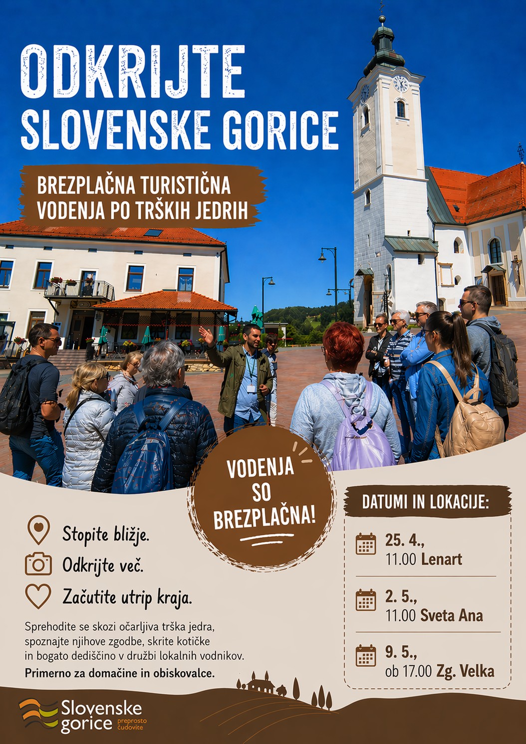 Slovenske gorice𝐁𝐫𝐞𝐳𝐩𝐥𝐚𝐜̌𝐧𝐚 𝐯𝐨𝐝𝐞𝐧𝐣𝐚 𝐩𝐨 𝐭𝐫𝐬̌𝐤𝐢𝐡 𝐣𝐞𝐝𝐫𝐢𝐡 vabijo – tako obiskovalce kot domačine. Sprehod skozi trg zanimivosti iz prve roke in skriti kotički – vse to v družbi 𝐥𝐨𝐤𝐚𝐥𝐧𝐢𝐡 𝐯𝐨𝐝𝐧𝐢𝐤𝐨𝐯, ki kraje res poznajo.Vodenja se bodo izvajala po vseh občinah Slovenskih goric – prilagamo okvirni seznam terminov, za sprotne najave in podrobnosti pa spremljajte naša družabna omrežja.𝐈𝐧 𝐣𝐚 – 𝐯𝐨𝐝𝐞𝐧𝐣𝐞 𝐣𝐞 𝐛𝐫𝐞𝐳𝐩𝐥𝐚𝐜̌𝐧𝐨 Ideja za izlet, ki preseneti.