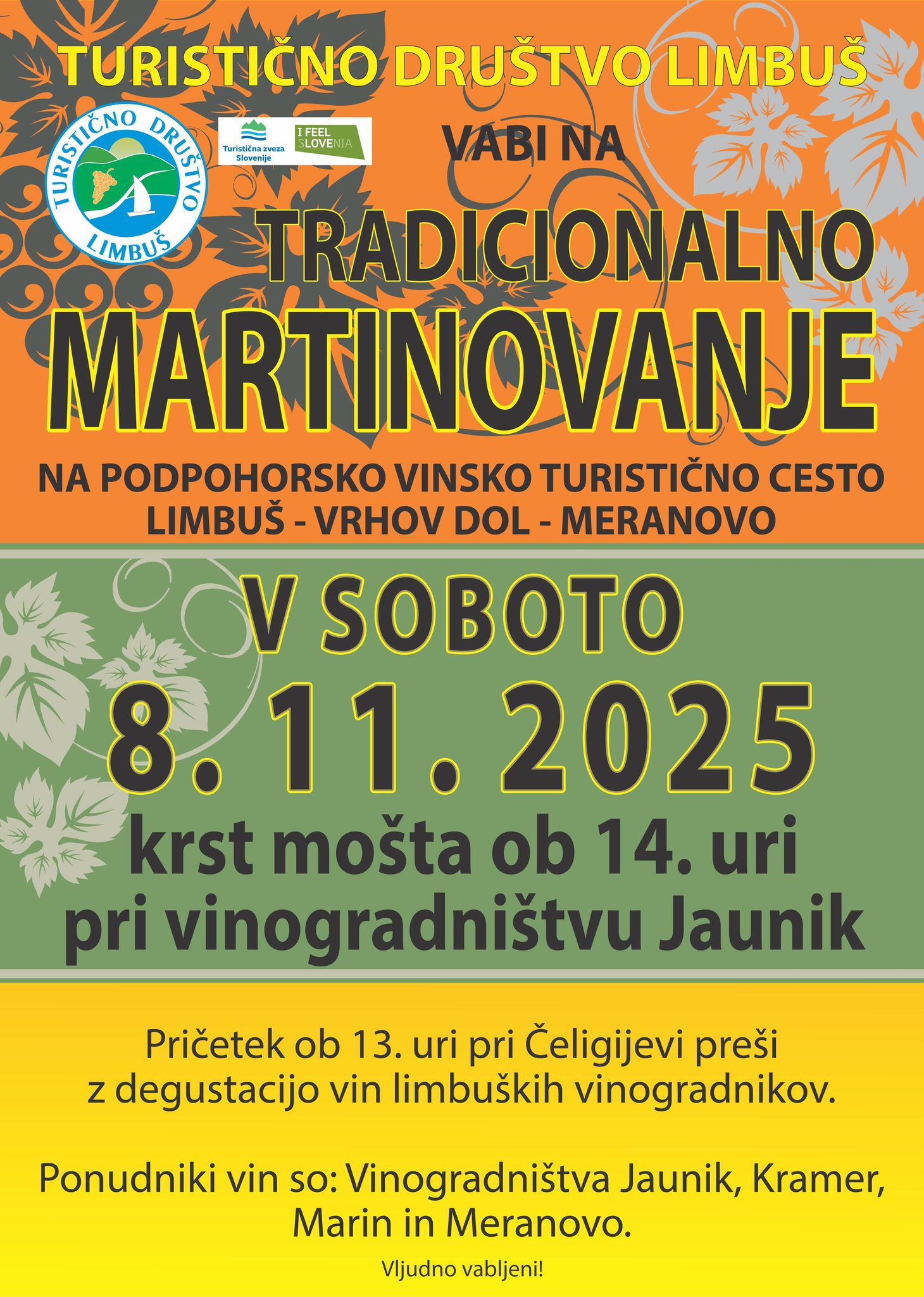 Podpohorska turistična cesta Limbuš-Vrhov dol-MeranovoTuristično društvo Limbuš vabi na nepozabno martinovo doživetje na relaciji Limbuš – Vrhov Dol – Meranovo. Pridružite se nam v soboto, 8. 11. 2025, ko bomo skupaj proslavili jesenske darove in po starem običaju krstili mošt.